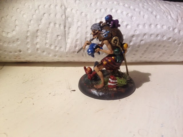 I just wanted to get a close-up shot of her face in here since i think it's the best I have ever done on someone's face. I usually struggle a lot with human eyes and I really like how her's ended up. I also painted her mouth pink and then washed it with flesh tone which I really like the effect of. Also she is so old she has no teeth. Which is particularly funny considering she is carrying around food she could never eat without teeth. You also get a better view of a couple of the voodoo dolls and the mushrooms and eyes on her left shoulder in this picture.